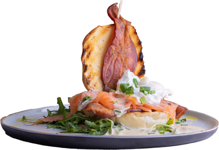 De koninklijke smaak van een absolute brunch-klassieker. Gepocheerd ei op een gegrild brioche broodje met uitgebakken spek, gerookte zalm en sla.